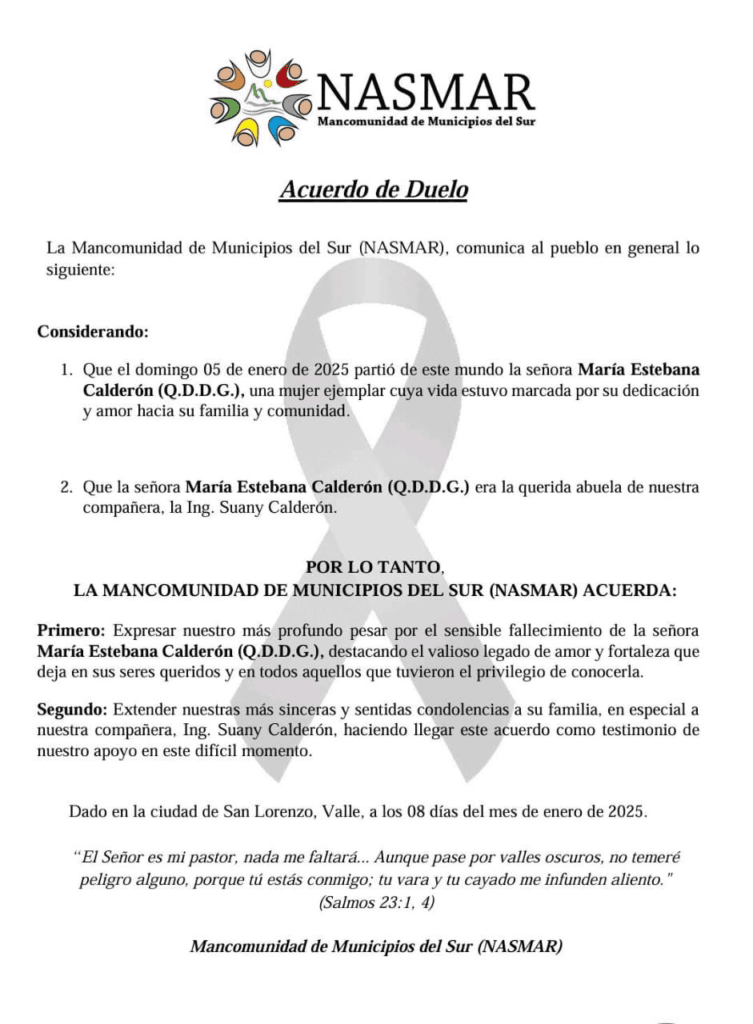 La Mancomunidad NASMAR lamenta el sensible fallecimiento de la Sra. María Estebana Calderón, quien era abuela de nuestra compañera de trabajo, la Ing. Suany Calderón. Expresamos nuestras más sinceras condolencias a ella y demás familiares.